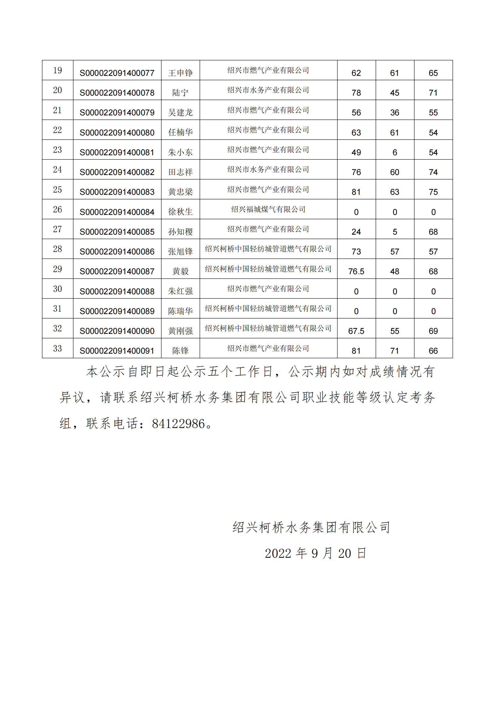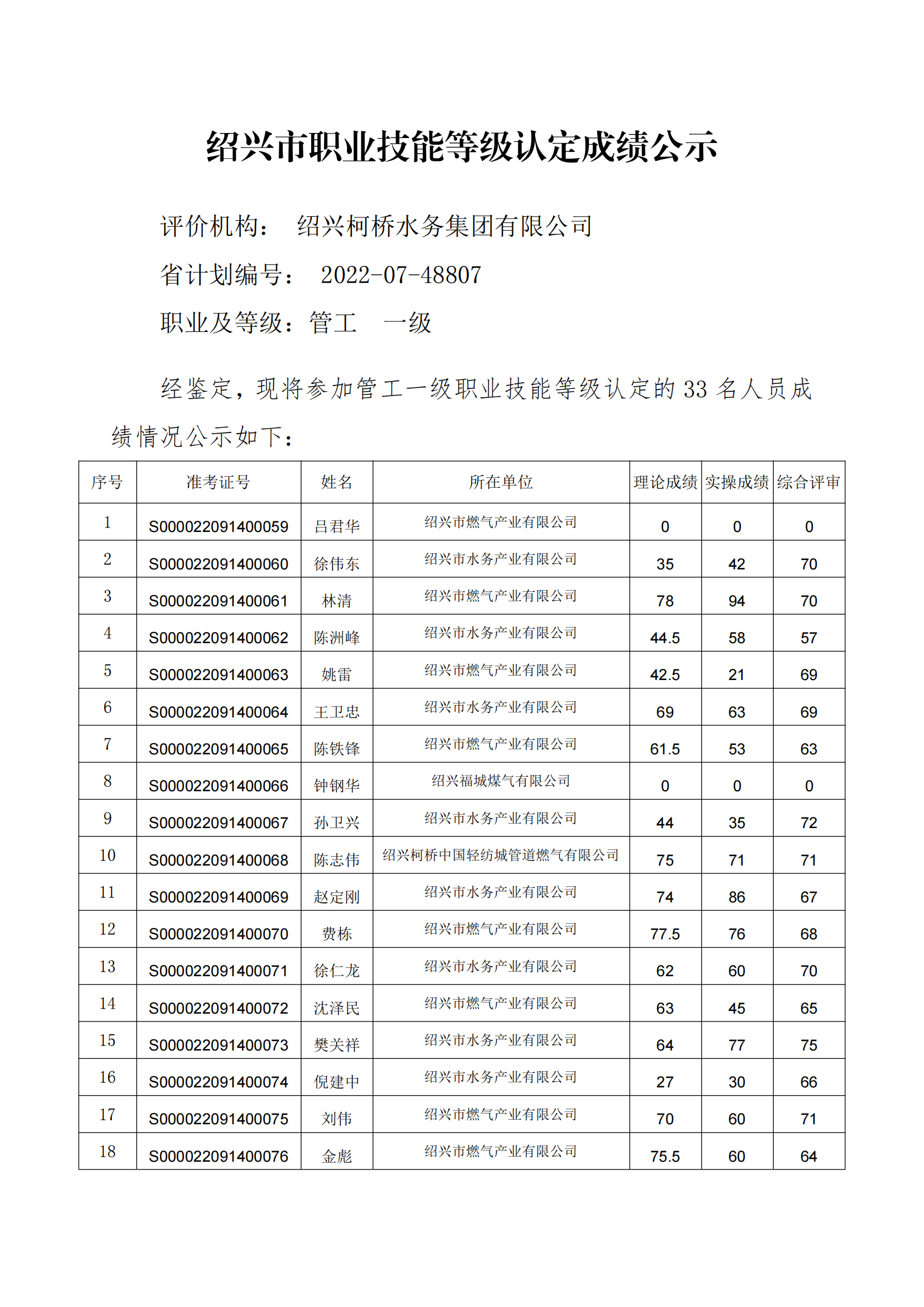 紹興市職業(yè)技能等級認定成績公示(管工一級)