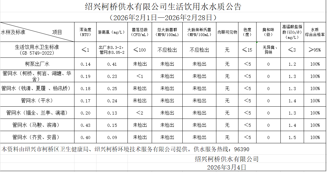 生活飲用水水質(zhì)公告(2026年2月1日—2026年2月28日)